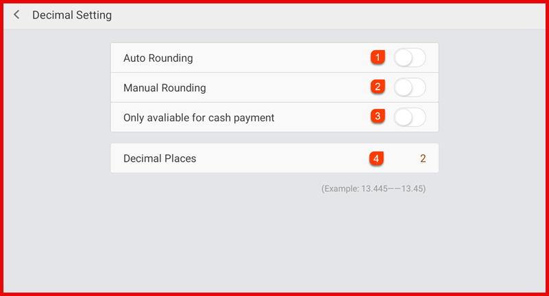 - Only available for cash payment – Apply rounding for cash payments only.