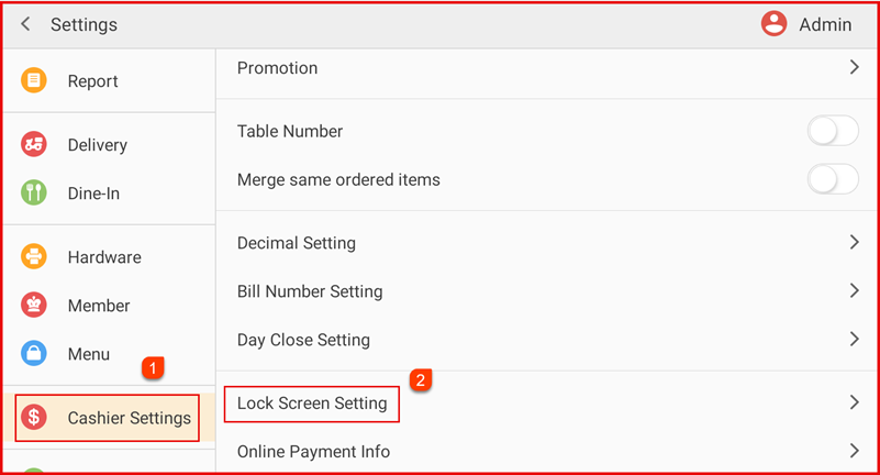 Go to Settings > Cashier Settings > Lock Screen Setting.