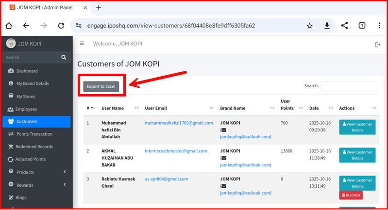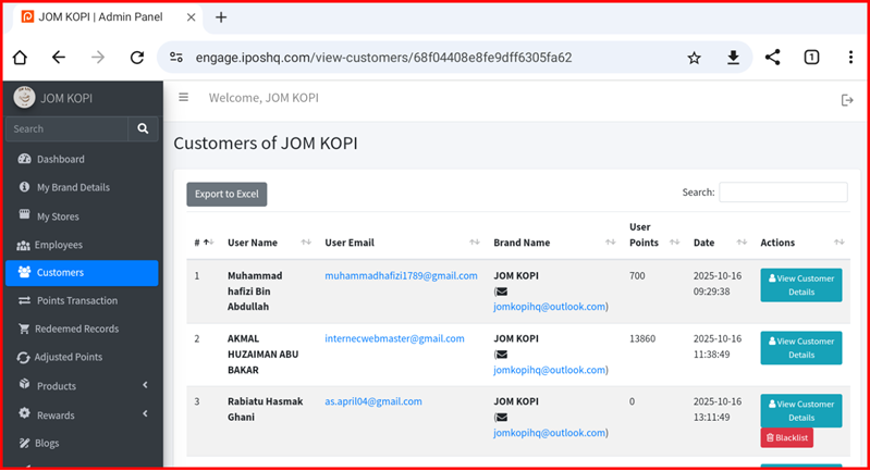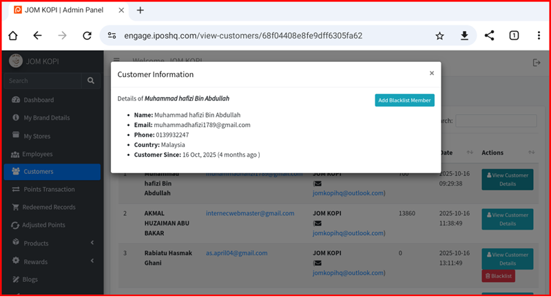 View detailed customer information including profile data, points history, and transaction records. You can also manage blacklist status from this section.