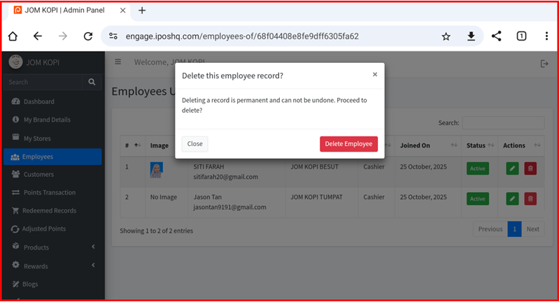 Remove an employee from the system. Click this button to delete an employee account. Note: This action cannot be undone.