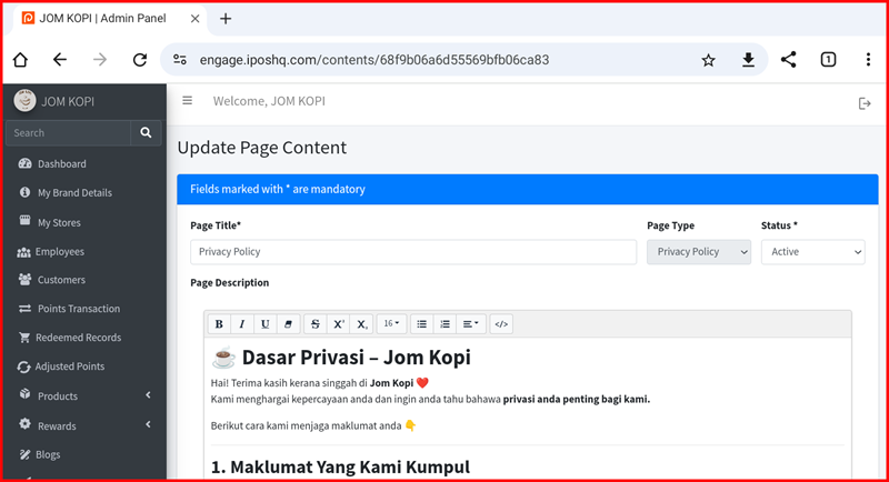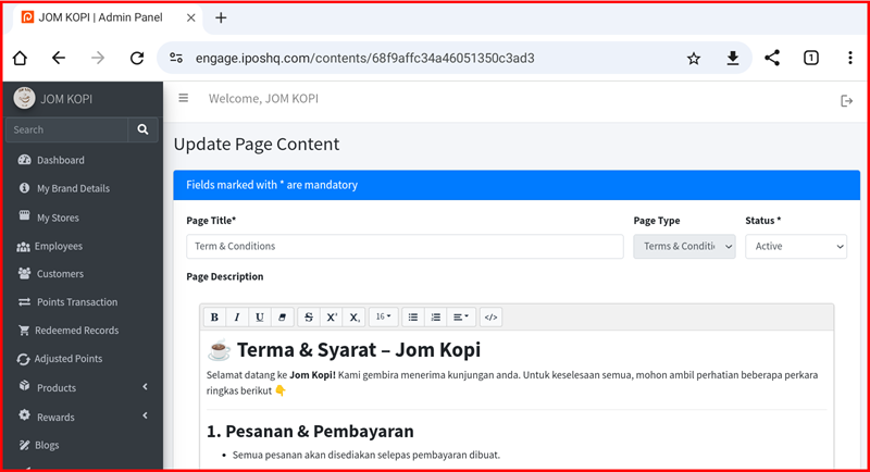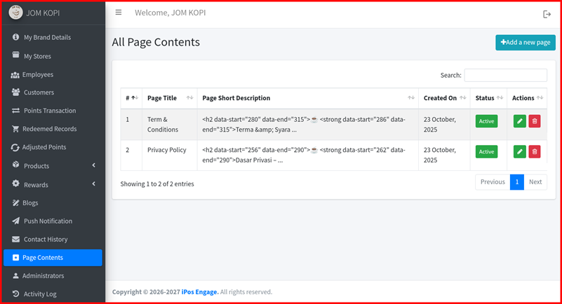 The Page Contents section allows you to create and edit static pages — such as Terms & Conditions and Privacy Policy — that are displayed inside the i-POS Engage member app.