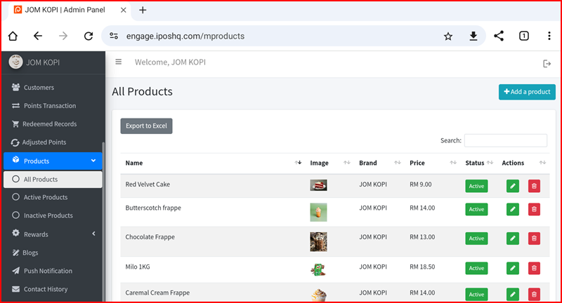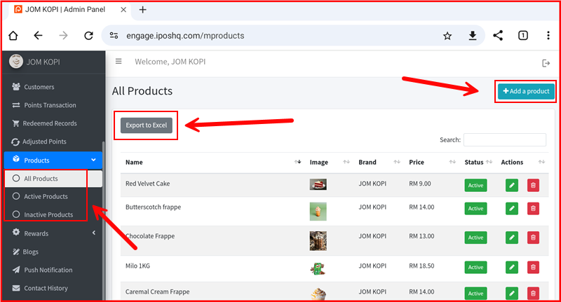 The Products section in the iPOS Engage backend allows you to manage all products linked to your brand. You can view all products, filter by status, export the list, and add new products.