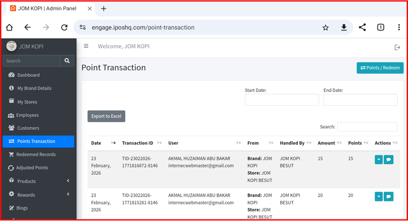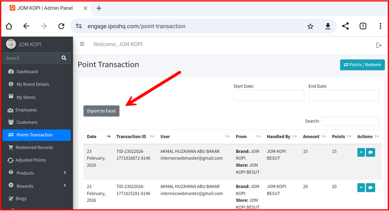 Export point transaction records to CSV or Excel format for external reporting or analysis. Click the export button and select your desired date range.