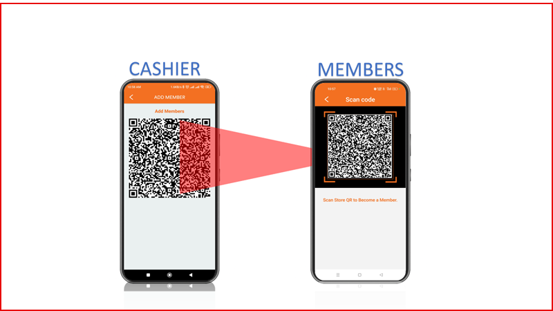 The member points their phone camera at the cashier's screen to scan the store QR code. The member's app will automatically read the QR code and retrieve the store details.