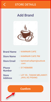 The member's app displays the Store Details. Review the brand name, store name, and address, then tap Confirm to join.