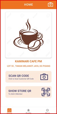 - SCAN QR CODE — scan a customer's QR code to collect points or redeem rewards