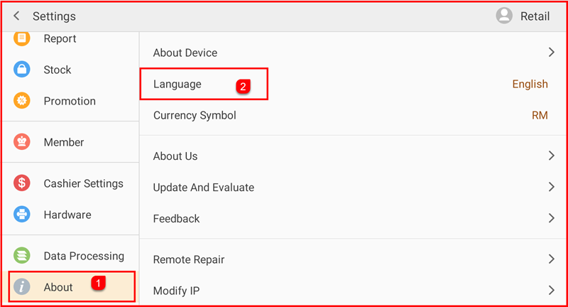 Tap Setting to open the Settings screen. In the left sidebar, tap About (①) to expand the About section. Then tap Language (②) on the right panel — the current language (e.g. English) is shown on the right.