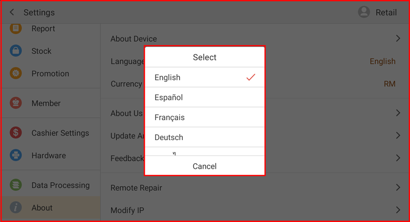 The Language setting allows you to change the display language of the iPOS Retail application. Multiple languages are available including English, Español, Français, Deutsch, and more.