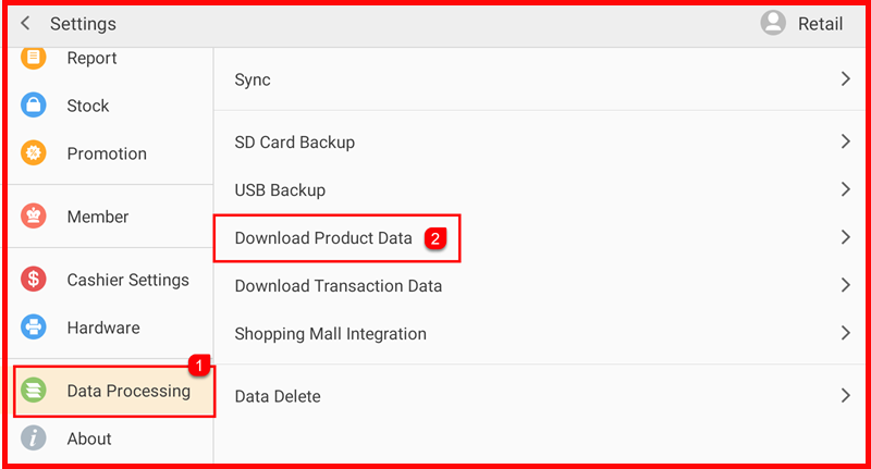Tap Setting to open the Settings screen. In the left sidebar, tap Data Processing (①). Then tap Download Product Data (②) on the right panel.