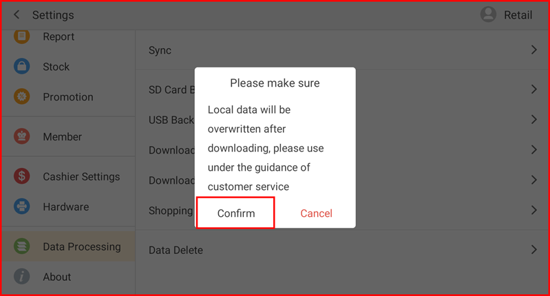 A Please make sure dialog appears with the message: "Local data will be overwritten after downloading, please use under the guidance of customer service." Tap Confirm to proceed, or Cancel to abort.