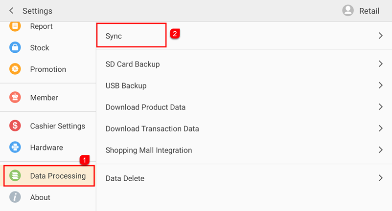 Tap Setting to open the Settings screen. In the left sidebar, tap Data Processing (①). Then tap Sync (②) on the right panel.