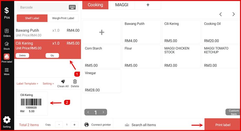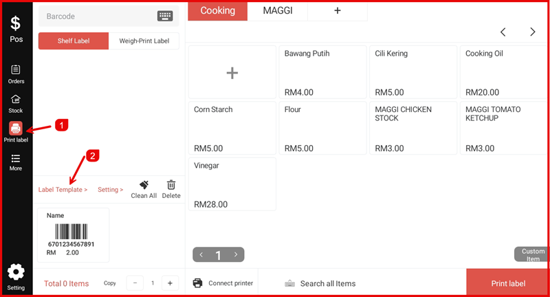 Tap the Print Label icon on the left sidebar to open the Print Label module. You will see the item list on the right and the label controls on the left, including the Label Template and Setting links.
