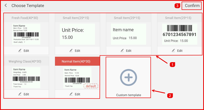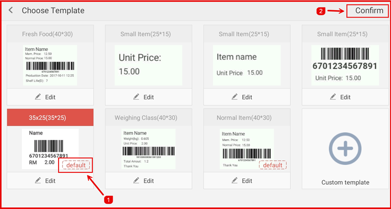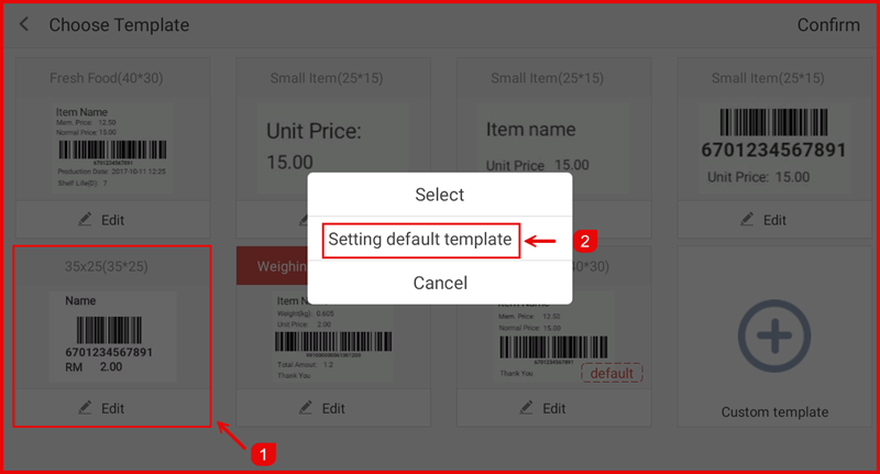 Tap Label Template > to open the template selection page. Choose from the available built-in templates or tap Custom template to create your own. Tap Confirm to apply the selected template.
