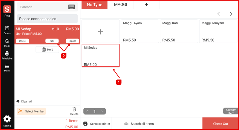 After adding an item to the cart (①), tap on it to reveal the action buttons. You will see Delete, Qty, and Reprice buttons (②) appear above the item row.