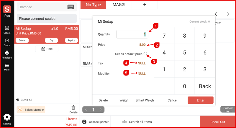 - Review or set Tax (④) and Modifier (⑤) if applicable.