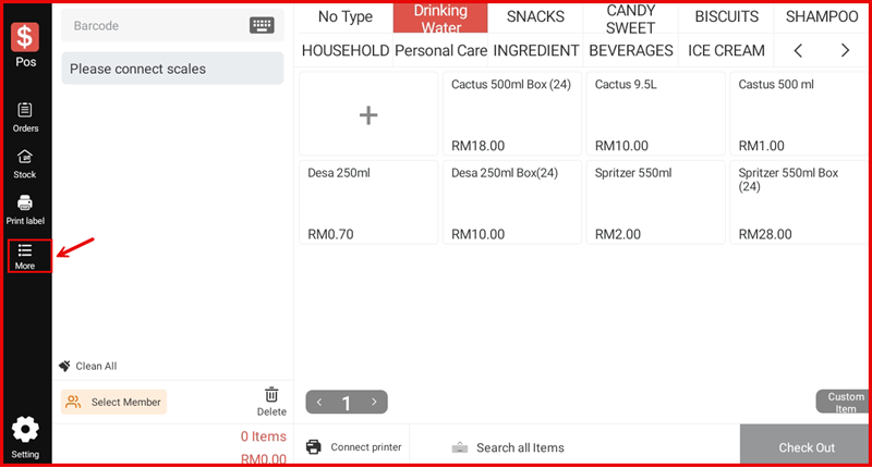 From the main POS screen, tap the More icon on the left sidebar to open the additional menu.