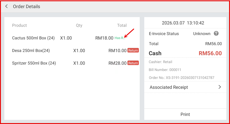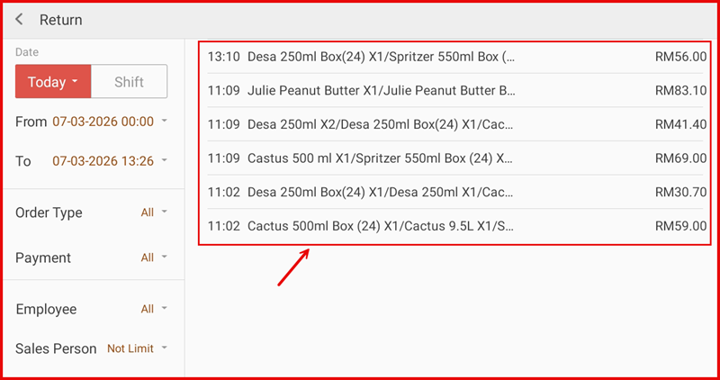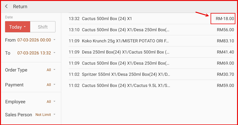 Go back to the Return screen. The completed return now appears at the top of the list with a negative amount (e.g. RM-18.00), confirming the refund has been recorded in the system.