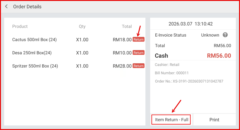 - Tap Item Return - Full at the bottom right to return all items in the order at once.