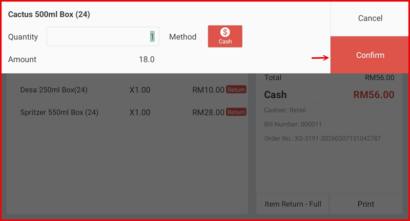 A dialog appears showing the item name, Quantity, refund Method (e.g. Cash), and Amount. Verify the details and tap Confirm to proceed.