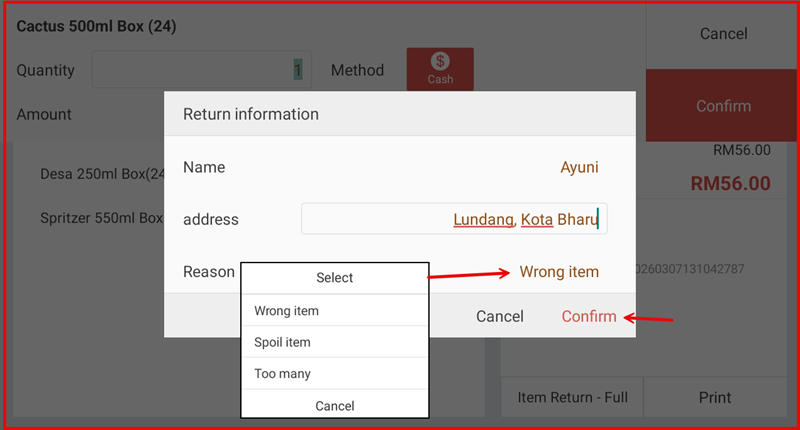 A Return information dialog appears. Enter the customer's Name and Address, then select a Reason from the dropdown: