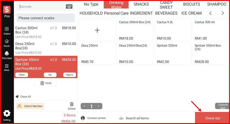 Add all items to the cart as usual. Once ready, tap Check Out to proceed to the Settlement screen.