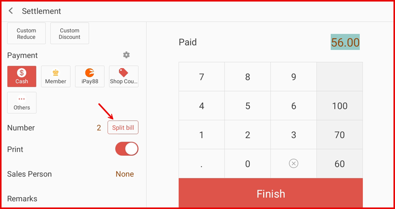 On the Settlement screen, locate the Number field and tap the Split bill button next to it.
