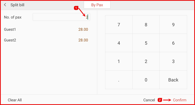 The Split bill screen opens on the By Pax tab. Enter the No. of pax (①) using the numeric keypad — the total will be divided equally and shown per guest (e.g. Guest1: RM28.00, Guest2: RM28.00). Tap Confirm (②) to apply the split.