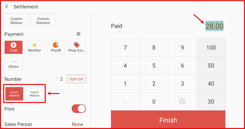 Back on the Settlement screen, each guest is shown as a card below the Split bill button (e.g. Guest1 RM28.00, Guest2 RM28.00). The active guest is highlighted and the Paid amount is pre-filled with their share. Select the payment method, confirm the amount, then tap Finish to process each guest in turn.