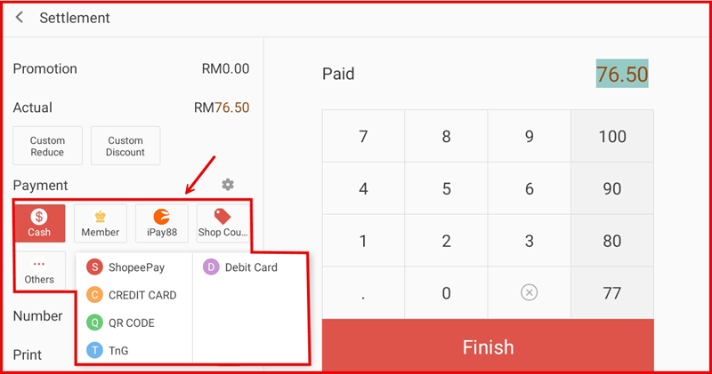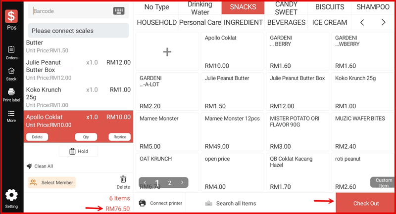 Add all items to the cart on the POS screen. Once the order is ready, tap Check Out at the bottom right to proceed to the Settlement screen.