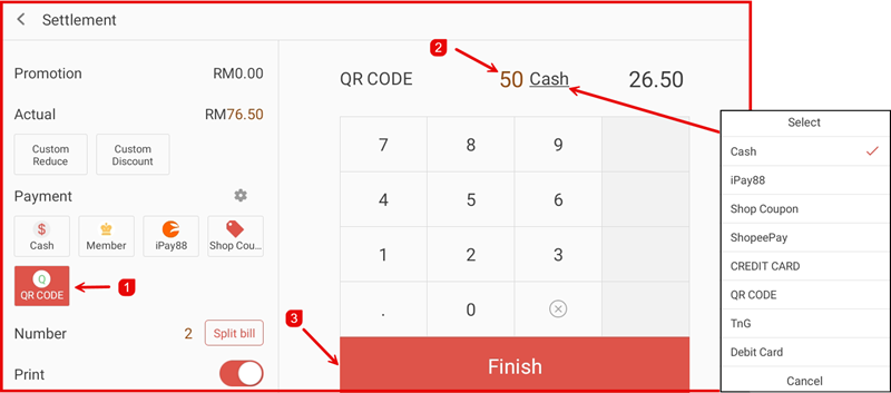 After selecting the first payment method (e.g. QR CODE), use the number pad to enter the partial amount the customer is paying with that method (e.g. 50). The remaining balance will be automatically calculated and shown next to the second payment method. Tap Split bill to confirm the split. The Number field shows 2, indicating two payment methods are in use. Tap Finish to complete the transaction.