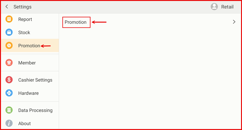 From the POS Settings screen, tap Promotion in the left sidebar, then tap Promotion on the right panel.