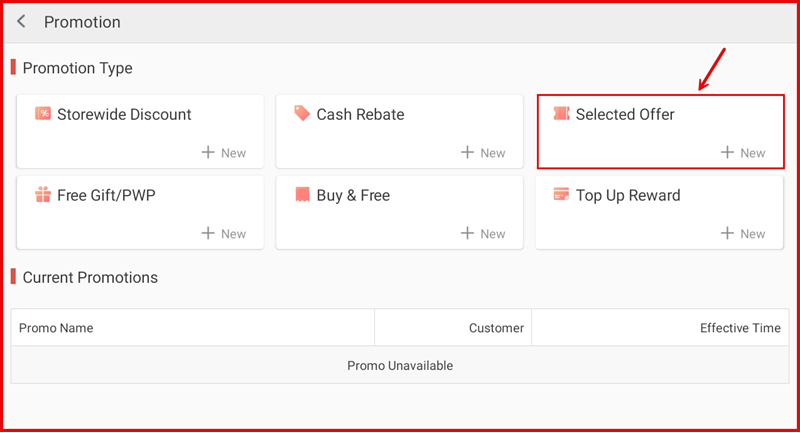 On the Promotion page, tap + New in the Selected Offer tile.