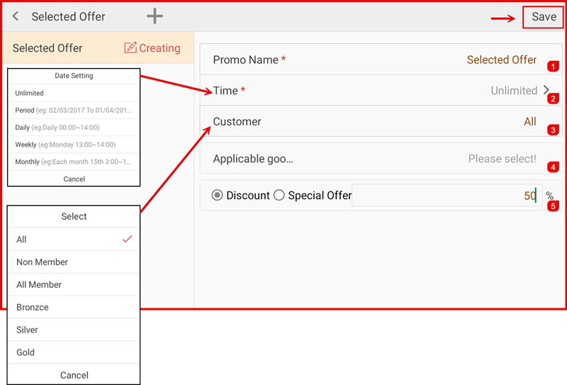- ④ Applicable goods — Tap to select the specific items this promotion applies to.