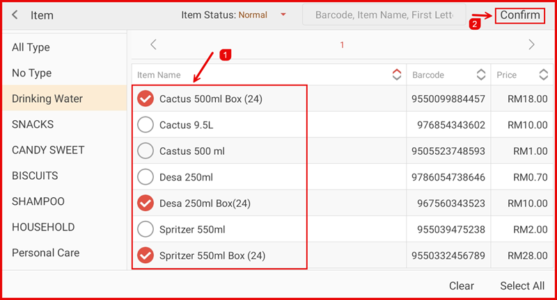 On the item selection screen, filter by category on the left sidebar, then tick the items (①) to include in the promotion. Tap Confirm (②) to apply the selection.
