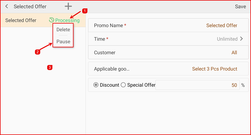 The promotion status shows Processing (①). Tap the name to see management options: Delete or Pause (②). The Applicable goods field (③) confirms the selected items.