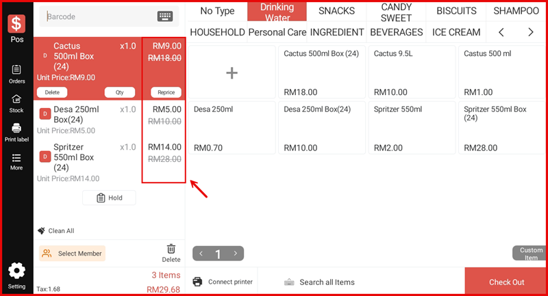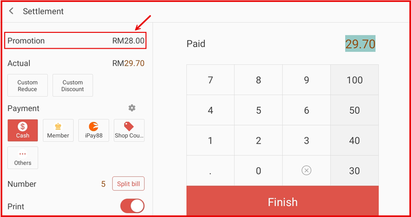On the Settlement screen, the Promotion row shows the total savings deducted (e.g. RM28.00), and Actual shows the final payable amount after the promotion.