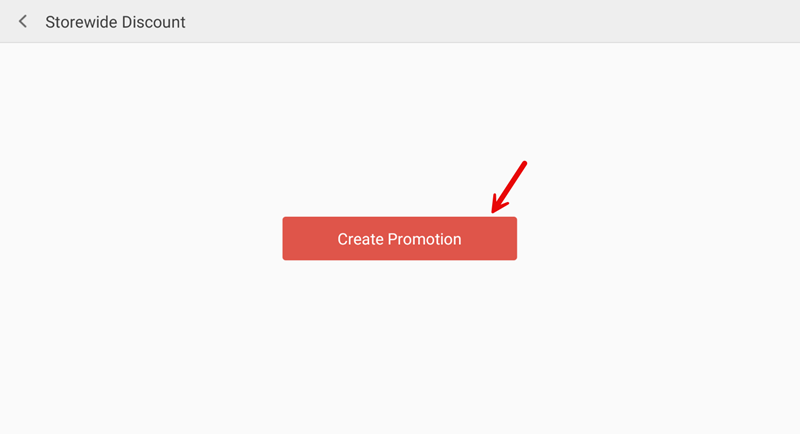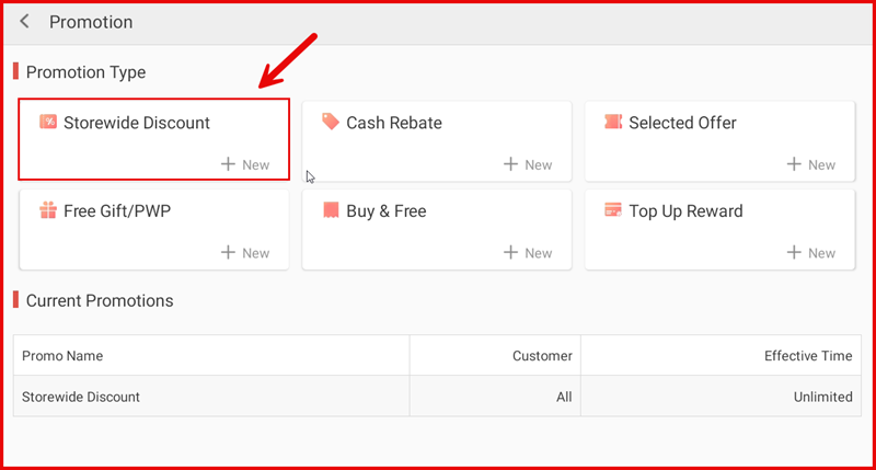 On the Promotion page under Promotion Type, tap + New in the Storewide Discount tile.