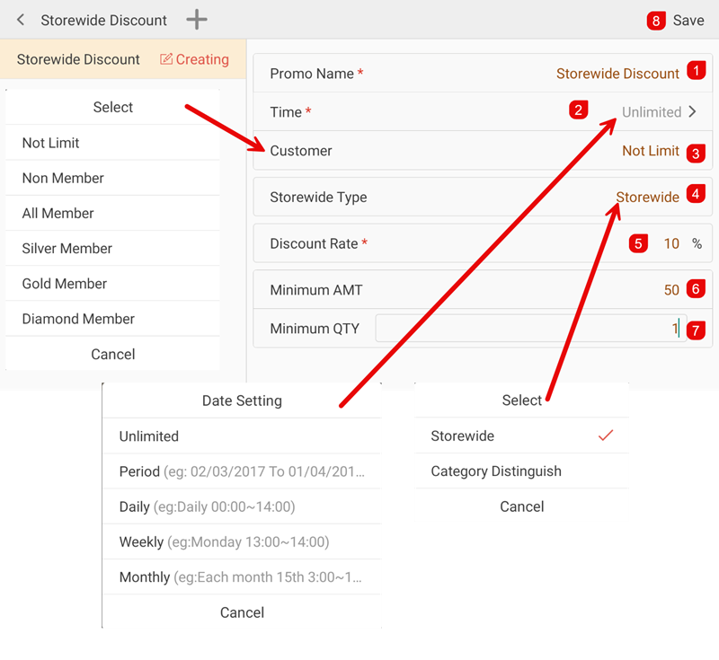 - ④ Storewide Type — Select Storewide (one rate for all items) or Category Distinguish (different rates per category).