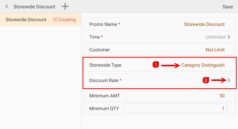If Storewide Type is set to Category Distinguish (①), tap the > arrow next to Discount Rate (②) to configure per-category rates.