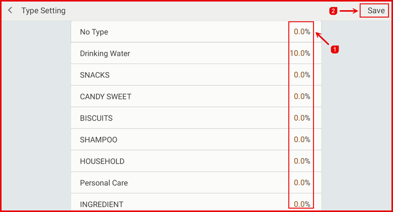 On the Type Setting page, enter the discount percentage (①) for each category. Tap Save (②) to apply the rates.