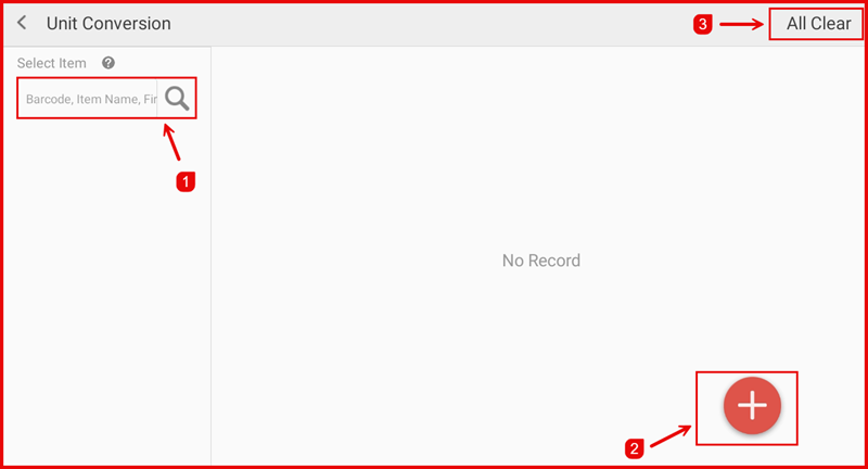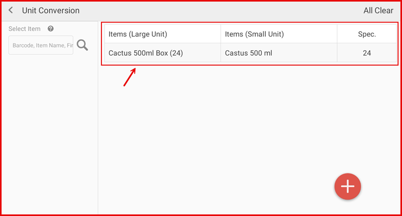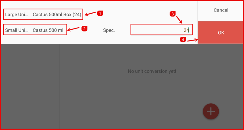 Tap the Add button to create a new unit conversion. Enter the base unit, converted unit, and the conversion rate (e.g. 1 carton = 12 pieces).