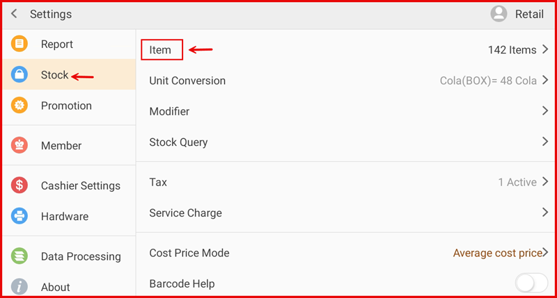 - Add Item — Add a new stock item with name, price, cost price, tax, and category