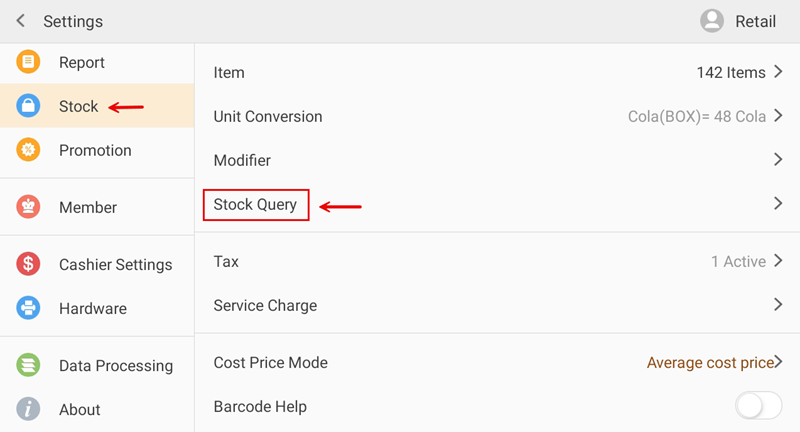 The Stock Query feature in iPOS Retail gives you a real-time view of your current stock levels, costs, and pricing across all items and categories. You can also filter for insufficient stock items and search by barcode or item name.