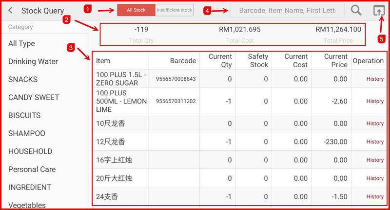 - Tab bar (①) — Switch between All Stock (view all items) and Insufficient Stock (view items below safety stock level).