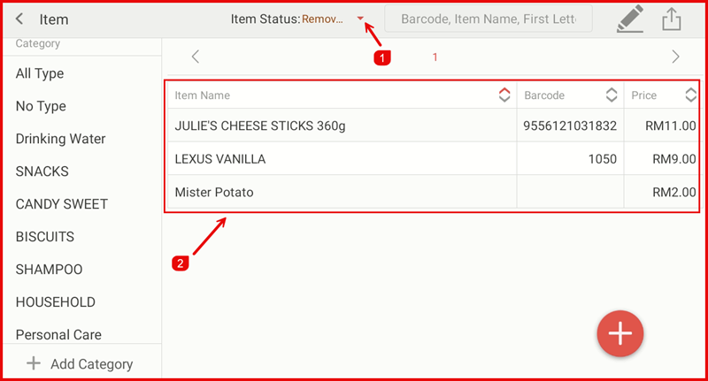 From the Stock settings, tap Item to open the item list. Use the Item Status filter (①) to view items by their current status (e.g. Active, Inactive, or Removed). The item table (②) shows the Item Name, Barcode, and Price for each filtered item. Tap the + button to add a new item.