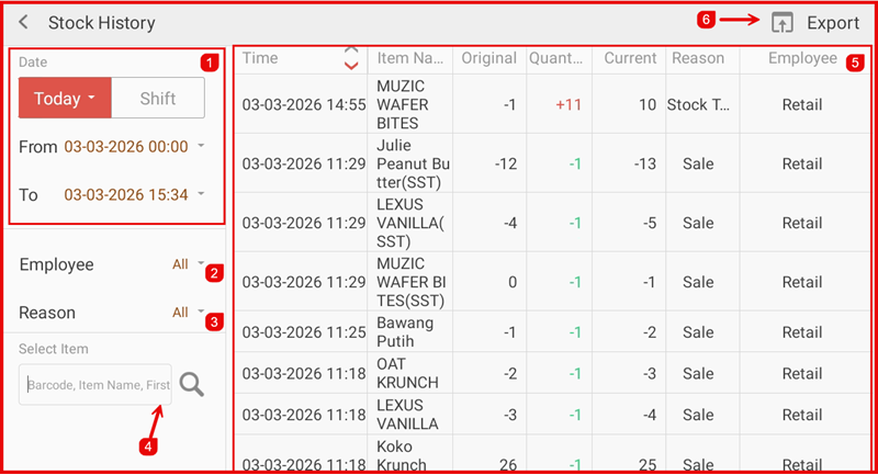 Use the date filter and item filter to narrow down stock movement records. Click the export button to download the history in CSV or Excel format for reporting purposes.